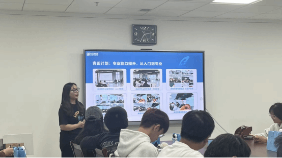宣讲会伊始,方田教育资深HR以创业初期牛肉酱和冰箱的故事为引,为同学们生动讲述了企业发展历程及人才培养机制与发展路径。在互动环节HR和同学们来了一场互动高潮。不仅有抽奖环节调动现场氛围,更特设“简历投递+现场面试”环节,同学们踊跃参与,直面HR,直接了解当下英专生的市场需求,为英专生后续发展提供多样化思路。
