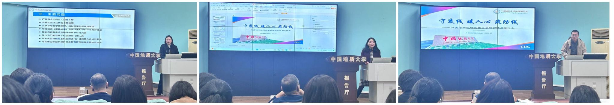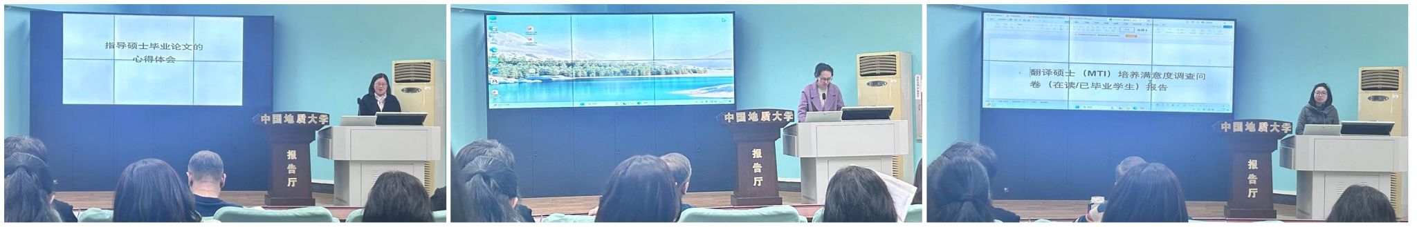 何霜、刘雪莲、李菲三位导师依次做了分享。何霜老师分享了指导硕士毕业论文的心得体会;刘雪莲老师结合寒假期间参加的导师培训,围绕翻译硕士论文写作和展开交流;李菲老师汇报了她对在读翻译硕士研究生及已毕业学生调查问卷结果,为后续优化培养方案提供了数据支撑。