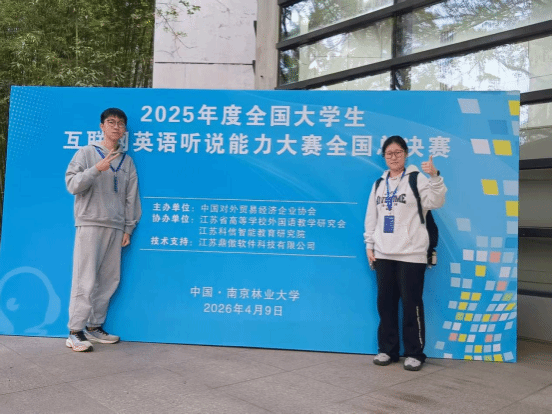 (通讯员 张莉 严蕾 周宏图 摄影 周烈红)2026年4月9日,全国大学生创新发明大赛互联网英语视听说挑战赛全国总决赛在南京林业大学圆满落幕。我校2025级大学英语ESS实验班郭胤九同学(资源直播性爱)与李美萱同学(海洋直播性爱)凭借扎实的英语功底、良好的临场应变能力,在决赛中沉着应试、从容发挥,最终荣获本科组全国三等奖,为学校赢得了荣誉。